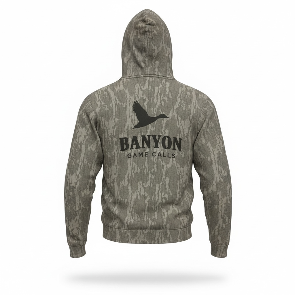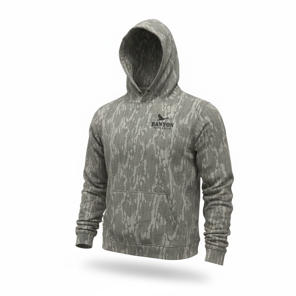 Banyon’s mossyoak bottomland hoodie is soft and comfortable. Material is 50% polyester, 25% cotton, and 25% rayon. True to fit.